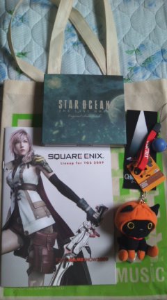そして右はスクエニ2009TGSパンフレット、ミュージックストアにて購入したスターオーシャン4サントラ、エコバック、ゲーセンで取った靴下にゃんこのキーホルダーです。